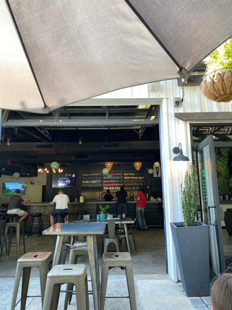 as building designers + space planners, we so appreciate the intentional design + textures happening here…lots of focus on the hops. the wood board light fixtures (in the shape of hops) illuminate the bar inside of raised garage doors, wall murals repeat this motif, while the pergola above offers a unique cover + gives a front porch feel. the umbrellas + pavers bring in some added depth making it feel cozy + comfortable to stay a while. just writing this, i’m already looking forward to our next visit.