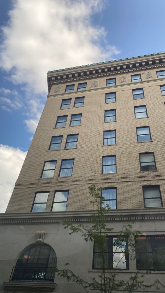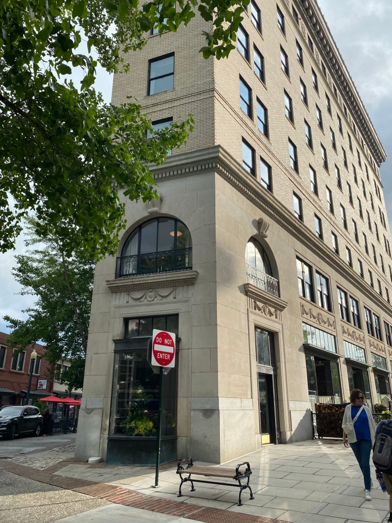 in our travels we have seen them at these types of intersections as a creative solution to an urban crossroads + we discovered one such building last summer in downtown asheville. its original incarnation was as an office building extending out of the central business district of booming turn-of-the-century asheville. long home to wwnc studios (radio) broadcasting all over the appalachian mountains, but had fallen out of favor + was in need of repair. its most recent life is as a newly envisioned boutique hotel with its past honored, preserved + even highlighted in a way that echoes its past while preserving its future. the once bustling business district of asheville has a different tone these days as it caters to retail shoppers, downtown diners + tourists looking for an urban mountain escape.