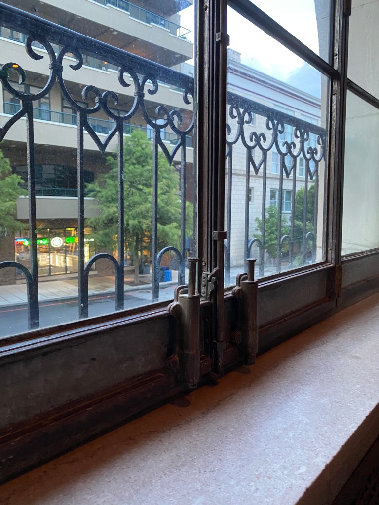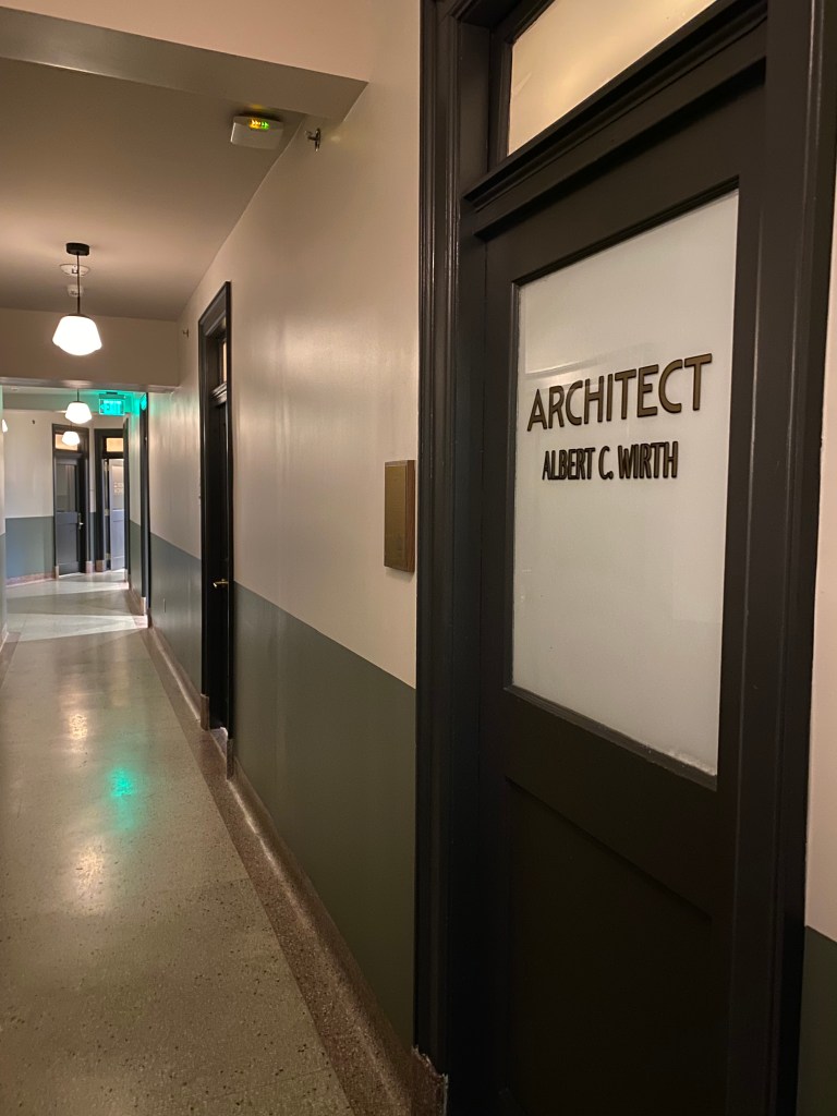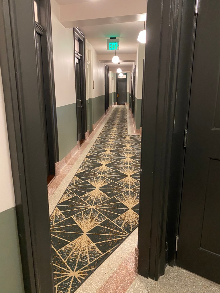 as you mosey around throughout your stay at this singular building, you’re sure to experience how it might have felt to come here a hundred years ago to visit your pharmacist, dentist, accountant, florist, take dance lessons….or maybe even to hire a local architect! all these + more previous tennants’ doors are beautifully preserved with timeless frosted glass + painted signage dotted between newly created suites + it gives the feel of being a part of this community, even while just visiting.