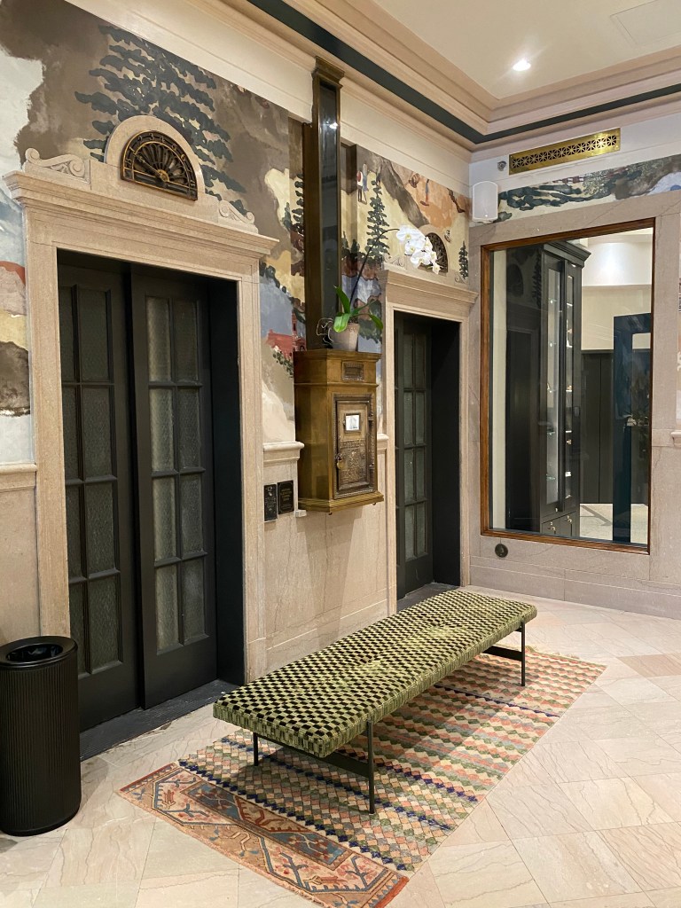 stepping inside is walking back into to an era of handcrafted details: stonework, metal framed windows with cast iron accentwork + hardware, soft interior lighting + architectural handiwork that isn’t seen often in today’s construction. no detail is left unnoticed as the antique elevator + mail shaft have also been refurbished while the textiles + wall coverings bring in a fresh touch of interest in every nook, all relating back to this building’s timeless location.